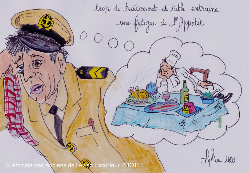 La cafétaria équipage profitait selon les recettes coopérative pour une amélioration des repas, et puis chacun le sait les carrés bien souvent par amitié ou récompense invitait chacun à leur tour quelques pompons rouges pour venir partciiper à un bon repas. KÉNAVO
