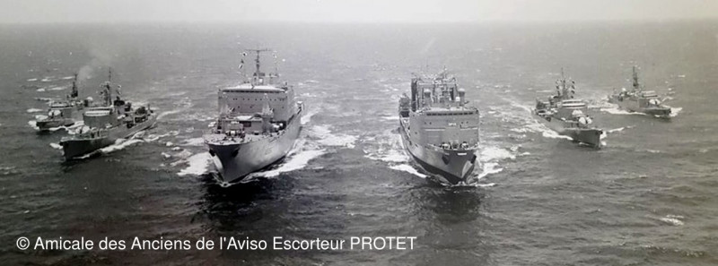 Quelque part en Méditerranée, sans doute pas très loin de Toulon, pour la photo de fin de stage, j'ai oublié le nom de cette formation, mais "vol de canards" n'irait pas mal, notre Protet est le deuxième à partir de la droite de la photo (facile : on reconnait bien le mortier ASM derrière la tourelle 1)