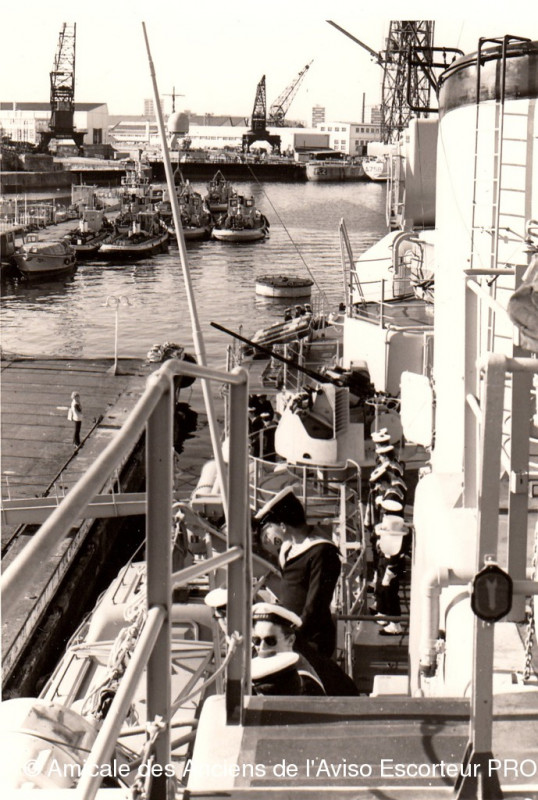 on aperçoit au fond, en bassin de radoub, les super structures de la corvette ACONIT en cours d'achèvement de mise en service à la mer. programme 1965.1970