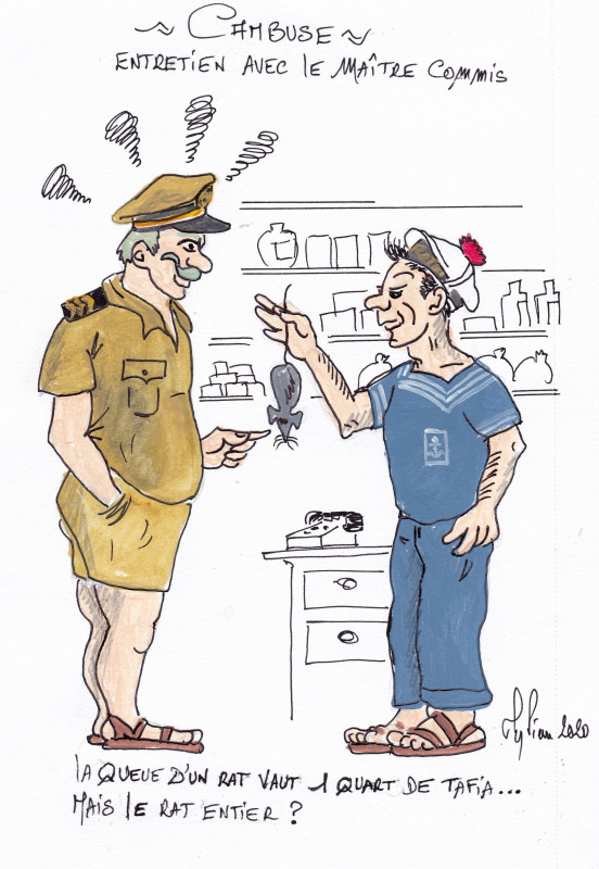 HISTOIRE VRAIE - en juillet 1975 sur le retour en métropole nous avons fait relache à MADRAS (Inde) malgré les pare-rats sur les aussières, nous avons embarqué non seulement de l'eau polluée mais aussi des rats, l'O.2 le LV SUMIEN organisera une chasse sur le bord, l'on prennait une baïonnette au B.S.I. et l'on patrouillait les coursives car récompense une queue de rat = une bonne rasade de tafia à la cambuse, abus ou pas quelques jours plus tard il fallait présenter le rat entier.