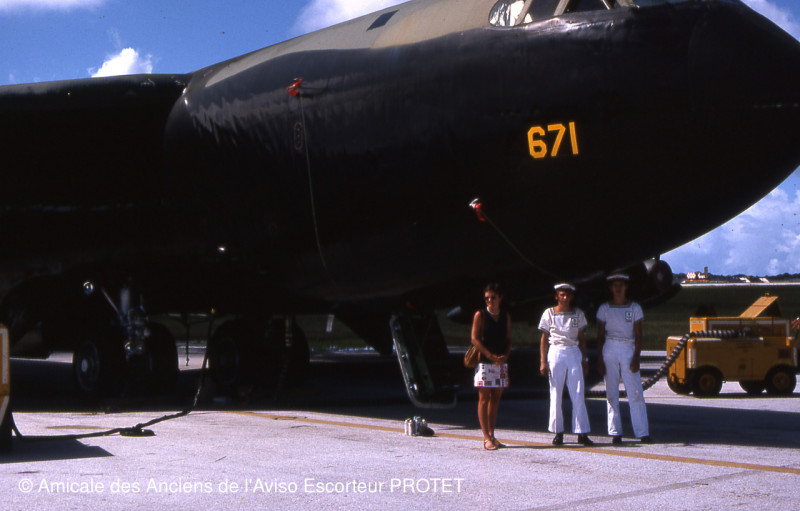 GUAM, à peine débarbouillé de mon passage de la ligne, cette escale a été une vrai découverte, accueil très sympathique des américains, qui nous ont fait visiter leur fameuse base aérienne pleine de bombardiers lourds B.52 (impressionnant le bout des ailes touchaient presque terre), mais la grande surprise fut d'accèder au camp de réfugiés jouxant la base, des milliers de vietnamiens (il y a encore la guerre au Vietnam) parqués dans des conditions précaires mais dans une belle discipline, nous ont accueillis à bras ouverts et dans un français encore éloquent, évoquant avec amitiés les souvenirs des colonies, très touchant pour moi, fils de marin ayant séjourné en Indochine en 1950.1953. Mais on a du abréger la visite car les autorités américaines n'ayant pas la même vision du partage, nous ont bien "accompagnés" vers d'autres lieux.