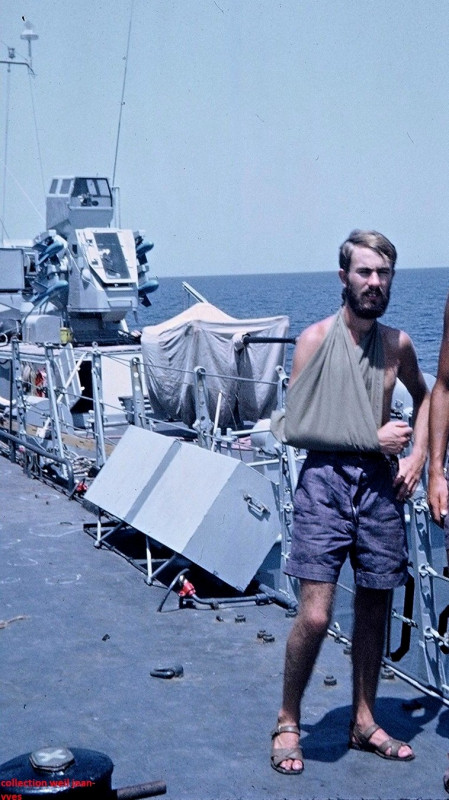 Après radio à l'I.H.I.A. j'étais atteint d'une luxation complète inférieure de la tête humérale gauche et d'une fracture avec arrachement de la coiffe supérieur (dixit certificat de monsieur HERB, médecin de 2éme classe des Armées du bord). Soigné par Gerdy plâtré du 7 au 26 juillet ou je suis resté hospitalisé à l'I.H.I.A. laissant appareiller notre aviso que j'ai retrouvé à DJIBOUTI après une période de rééducation, partie à l'I.H.I.A., partie Boulevard Jean Laborde ........