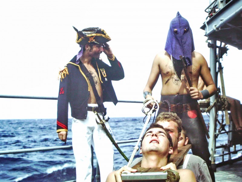 Certainement le plus beau que j'ai connu, car les néophytes n'étaient pas très nombreux ce qui avait permis à l'ensemble de l'équipage de peaufiner les parures appropriées à l'évènement, une grande élégance avec une Aphrodyte d'enfer(???) un somptueux Neptune (TIRARD J.luc)et bien sur un talent dans le maître d'équipage et ses adjoints (HAUSSWIRTH serge et un bourreau très méchant BERNAUX Michel) un tribunal (SKRZYPCAK J.Marie juge et son émir MOURRAT Gilles) un dernier sacrement avec l'évêque - moine (NIED J.Charles) le meunier (MURRAY J.Marc, AUBRY ??) et hop dans les bras des sauvages pour en faire un vrai MARIN.