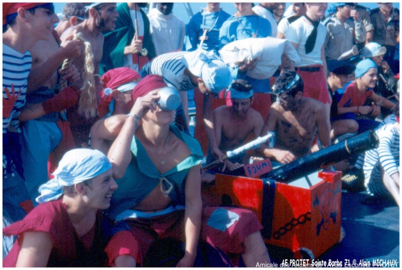 A bord , c’est donc le service artillerie qui l’a célèbre dans la plus pure tradition de la Marine : Le plus jeune des « art », aussi appelé « Bidou » (du breton bidouric qui signifie dernier de la famille), se déguise en Barbe (aussi avenante que dans l’histoire…). Il fait ensuite le traditionnel tour des carrés, gratifiant les membres d’équipage les plus chanceux d’un baiser délicatement parfumé. Ses camarades canonniers entonnent ensuite (d’une voix digne de celle des petits chanteurs à la croix de bois) les plus fines chansons de leur répertoire tout en traînant derrière eux un redoutable canon en… carton qui tire des confettis.