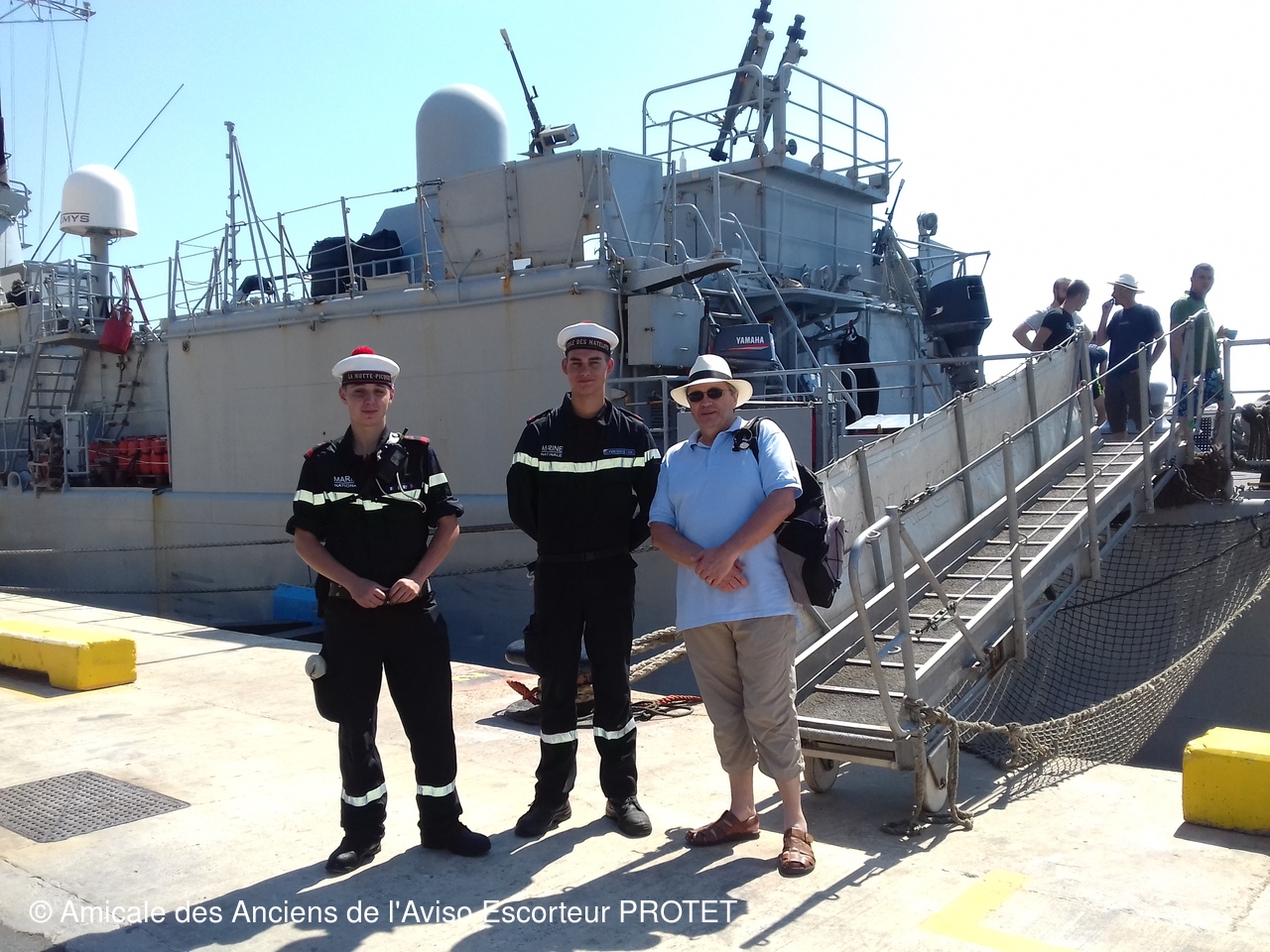 Je n'ai pas pu monter à bord "faute de temps" car le plus long fut d'arriver au pied de la passerelle. Sans la négociation d'1 major avec les gendarmes maritimes locaux très pointilleux, je n'aurais même pas accédé au quai. La condition sine qua non était d'être le seul civil et accompagné jusqu'au retour par 1 marin français (celui qui fait la photo).