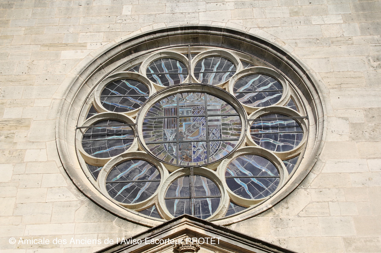 La rosace occidentale qui surmonte le portail - accommodée au goût du style classique - est garnie d'un vitrail moderne reproduisant les armes de Lorraine.