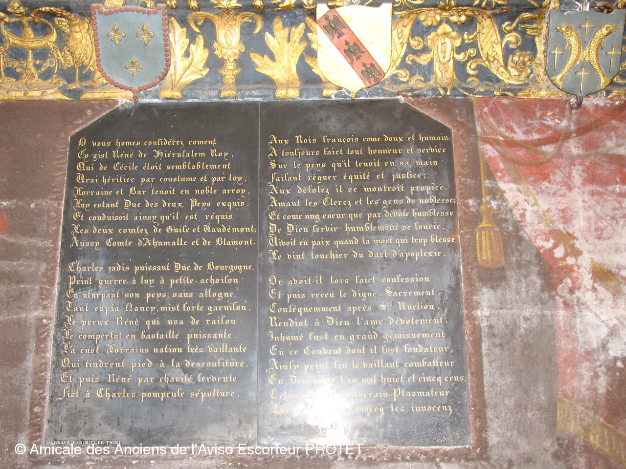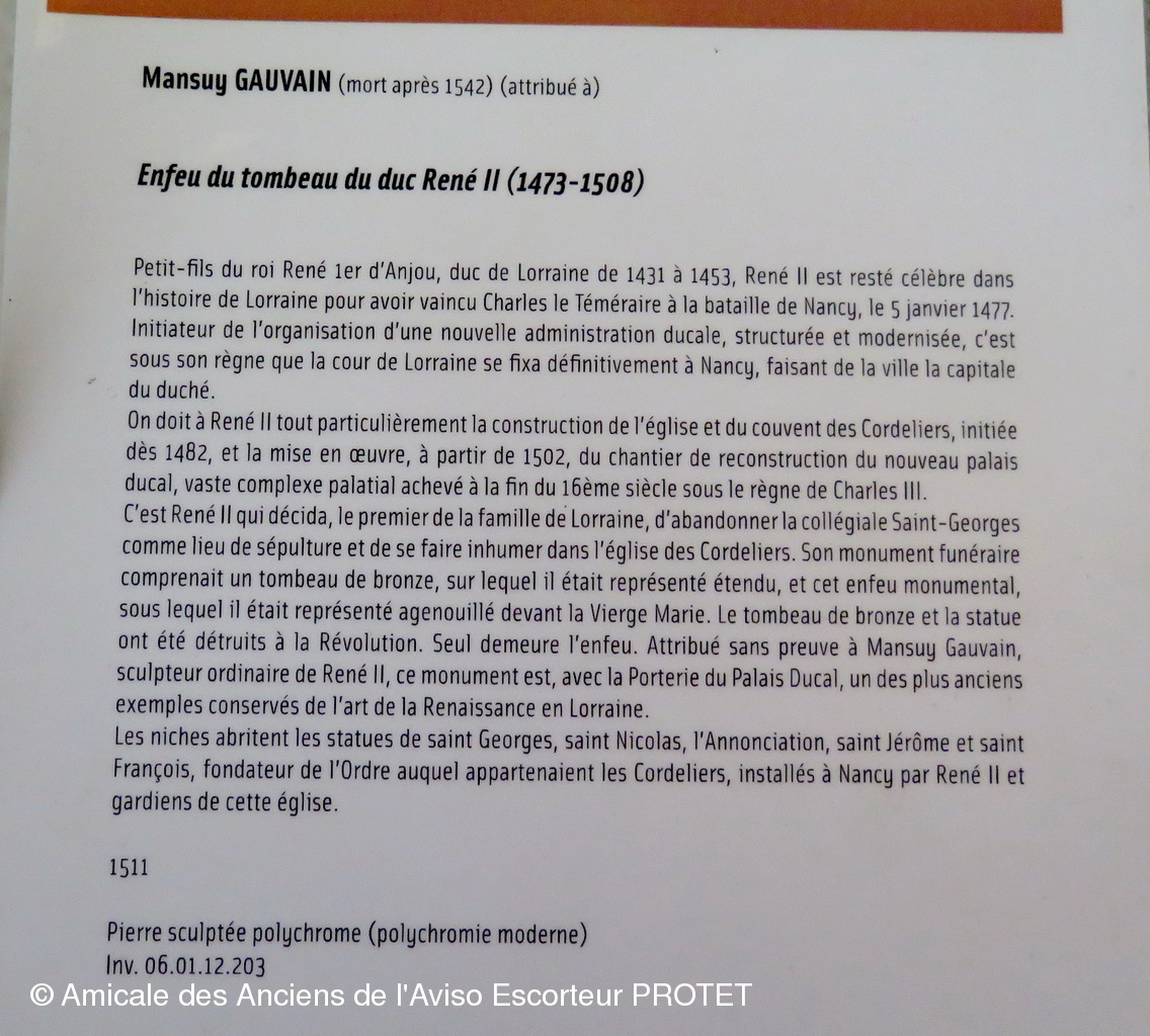 Au mur sud s'accroche un enfeu polychrome influencé par le style Renaissance, celui du duc René II, on y reconnaît les intercesseurs favoris du duc : Saint Georges, Saint Nicolas, l'ange et la Vierge de l'Annonciation, Saint Jérôme et Saint François d'Assise, perchés sur les armoiries ducales et lorraines, ils sont encadrés par des pilastres rehaussés de grotesques et dominés par une représentation de Dieu le Père. Le gisant et la statue de René en prière au pied de la Vierge furent anéantis à la Révolution.