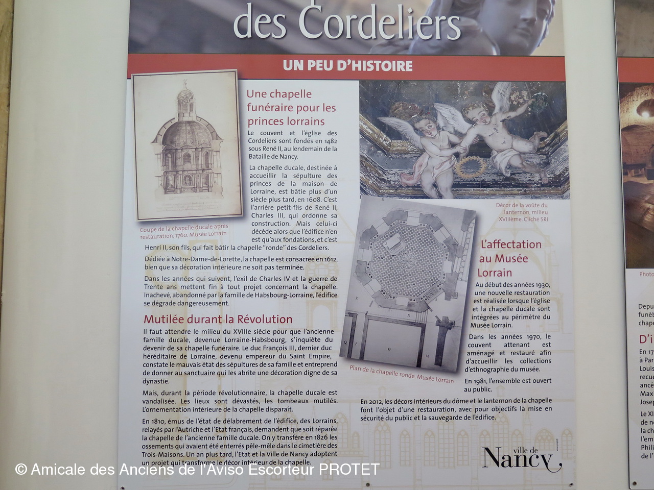 Autrefois reliée au palais ducal par un passage couvert, l'église des Cordeliers résulte du vœu de René II de faire élever un sanctuaire s'il était vainqueur de Charles le Téméraire. Ce lieu de culte fut consacré en 1487. Il consiste en une nef de 73 mètres de long qui reçut ultérieurement sur ses flancs des chapelles funéraires. Des vitraux animaient ces volumes de leurs reflets diaprés et la voûte de l'église s'ornait de fresques aux riches couleurs ; une portion de peinture intacte retrouvée au cours de travaux de restauration atteste de la qualité de ce décor.