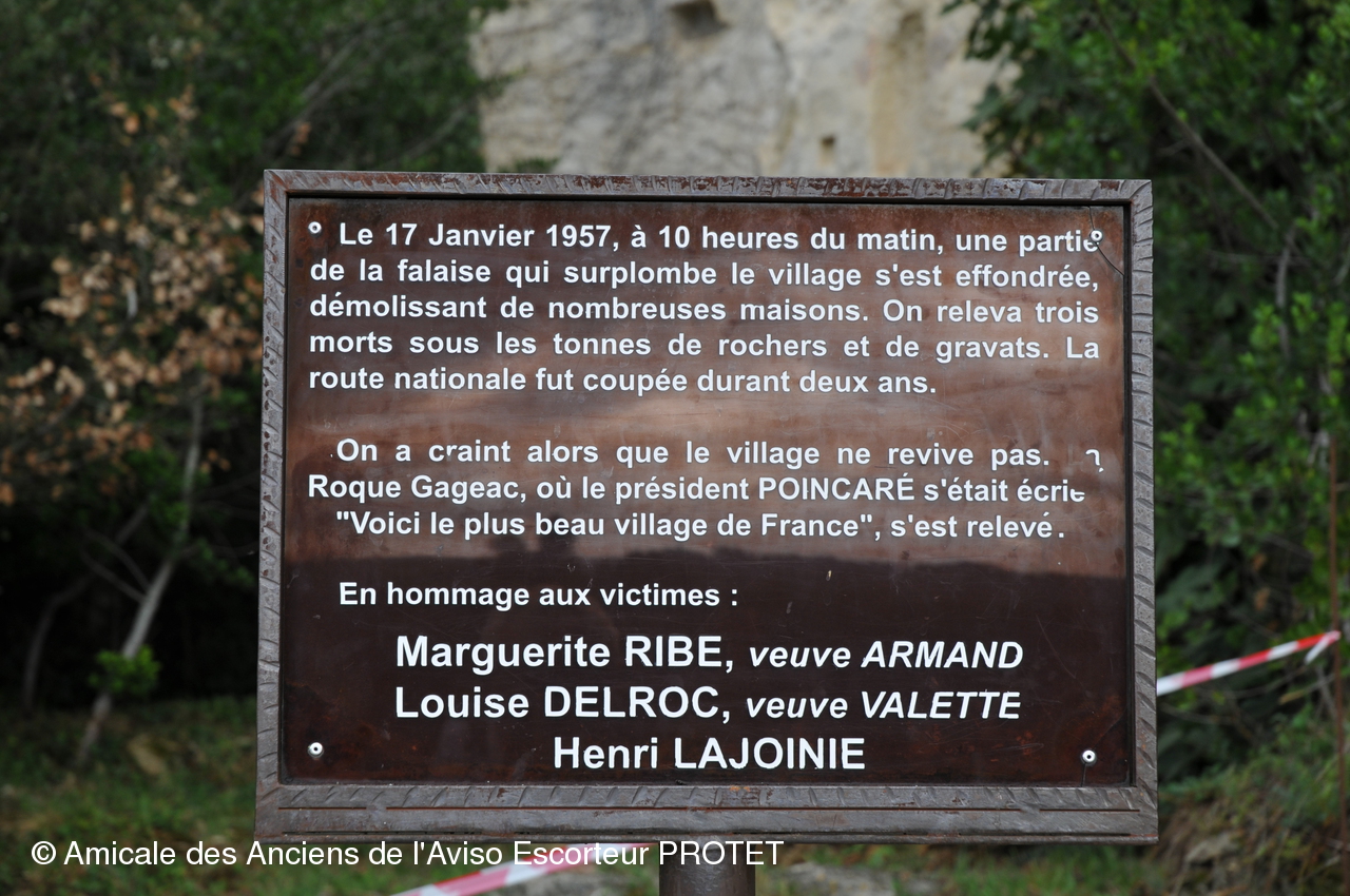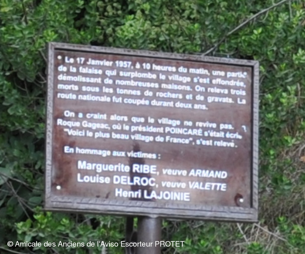 Une plaque rapelle que le 17 janvier 1957, un pan de la falaise s'éboule sur une partie du village, détruisant six maisons et une grange, coupant la route et terminant sa course dans la Dordogne. Trois personnes meurent.