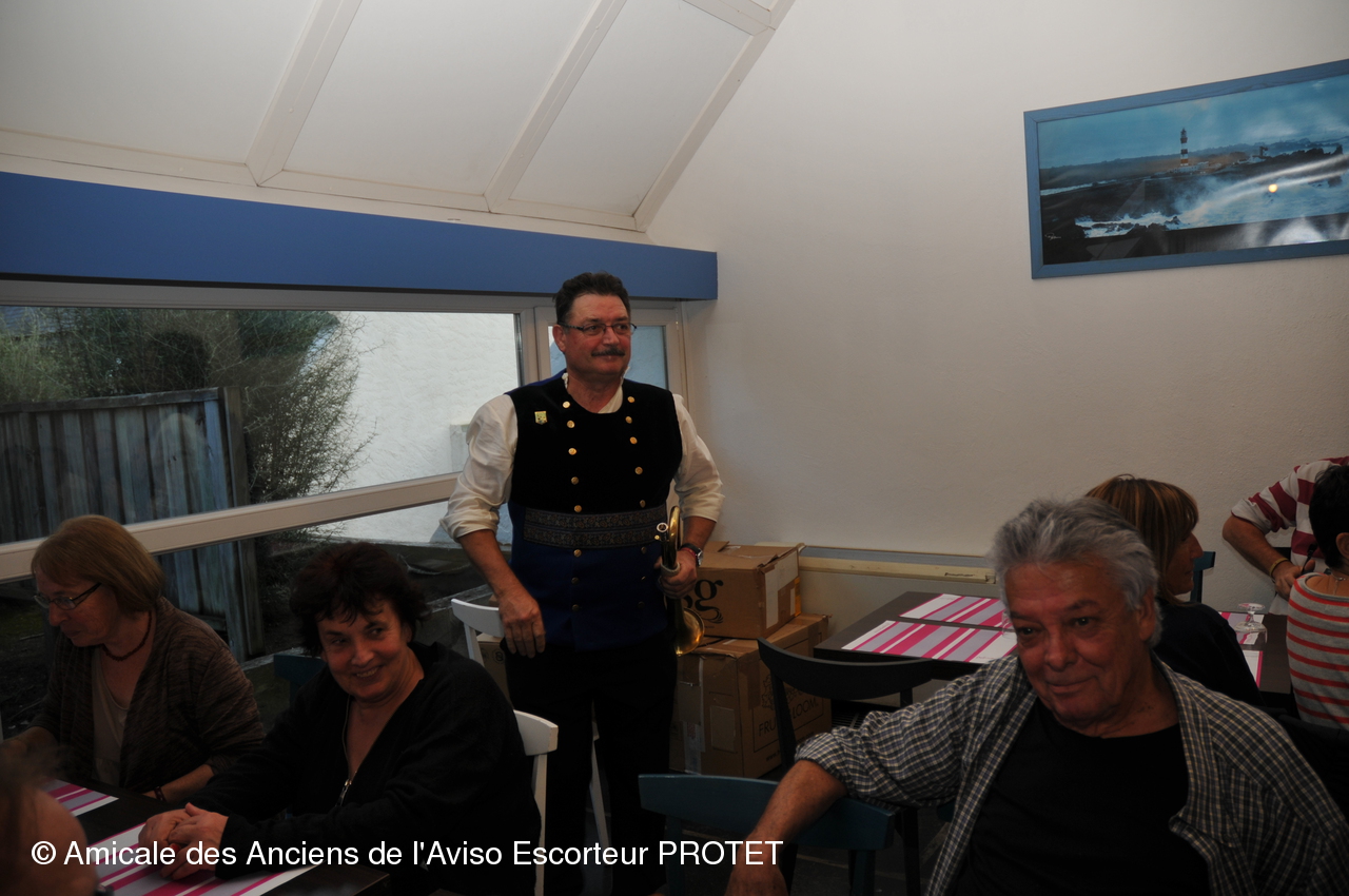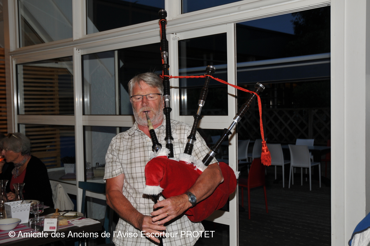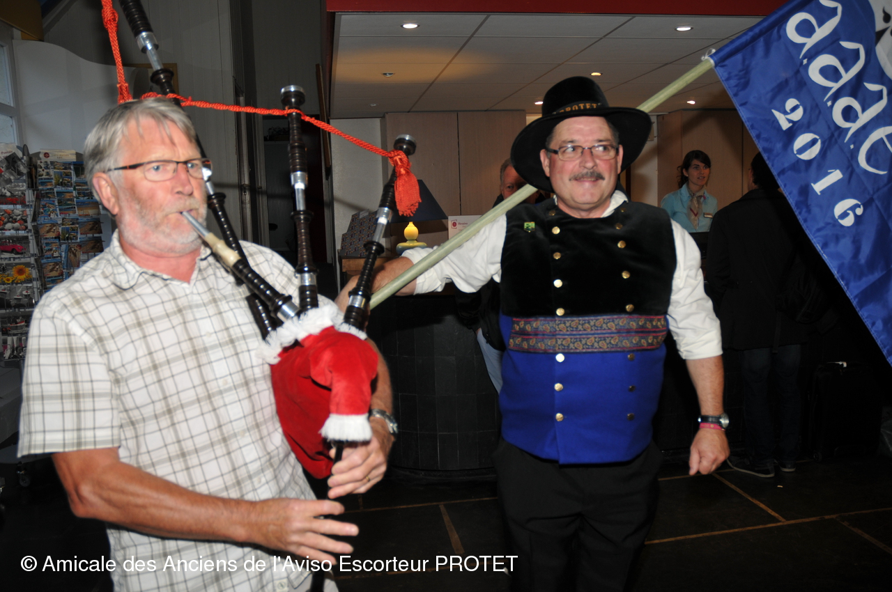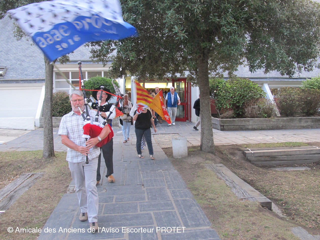 Merci à l'ami Pierrick pour son dévouement, sa disponibilité et pour le programme qu'il nous a préparé. Voila plus d'un an qu'il est dans les préparatifs de la réussite de ce rendez vous. Accueil dans le hall d'entrée du Club au son de la cornemuse, entrée des drapeaux, exposition d'objets de représentation du PROTET avec une complète marcophilie navale le représentant et des documents d'époque, voila une belle entrée en matière.