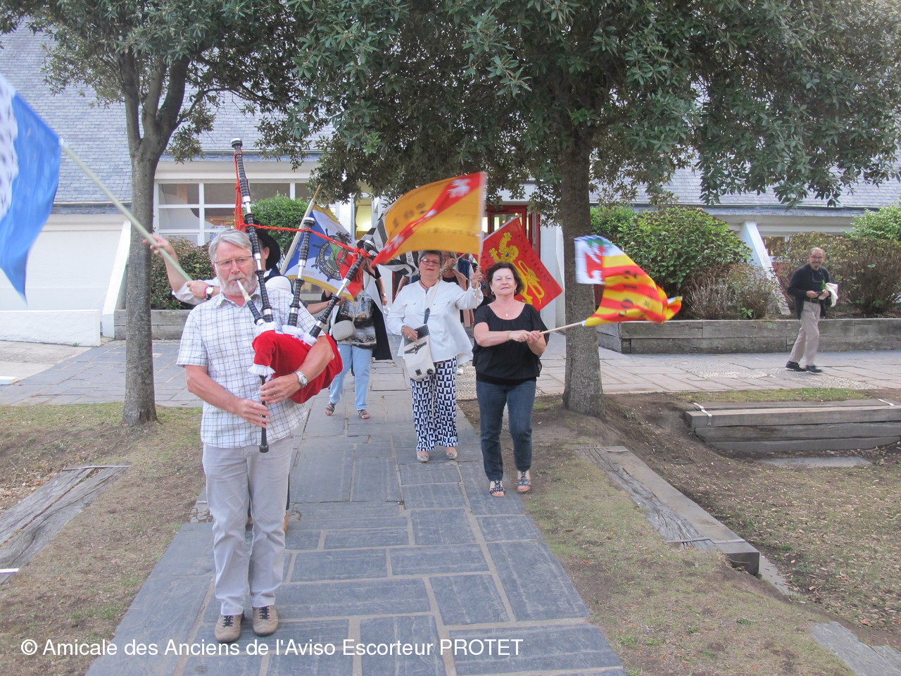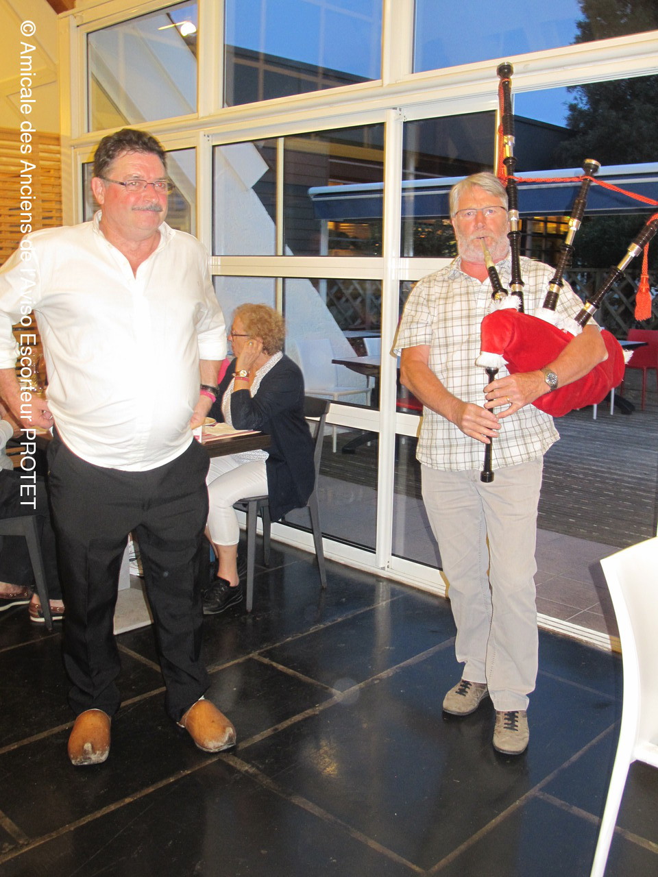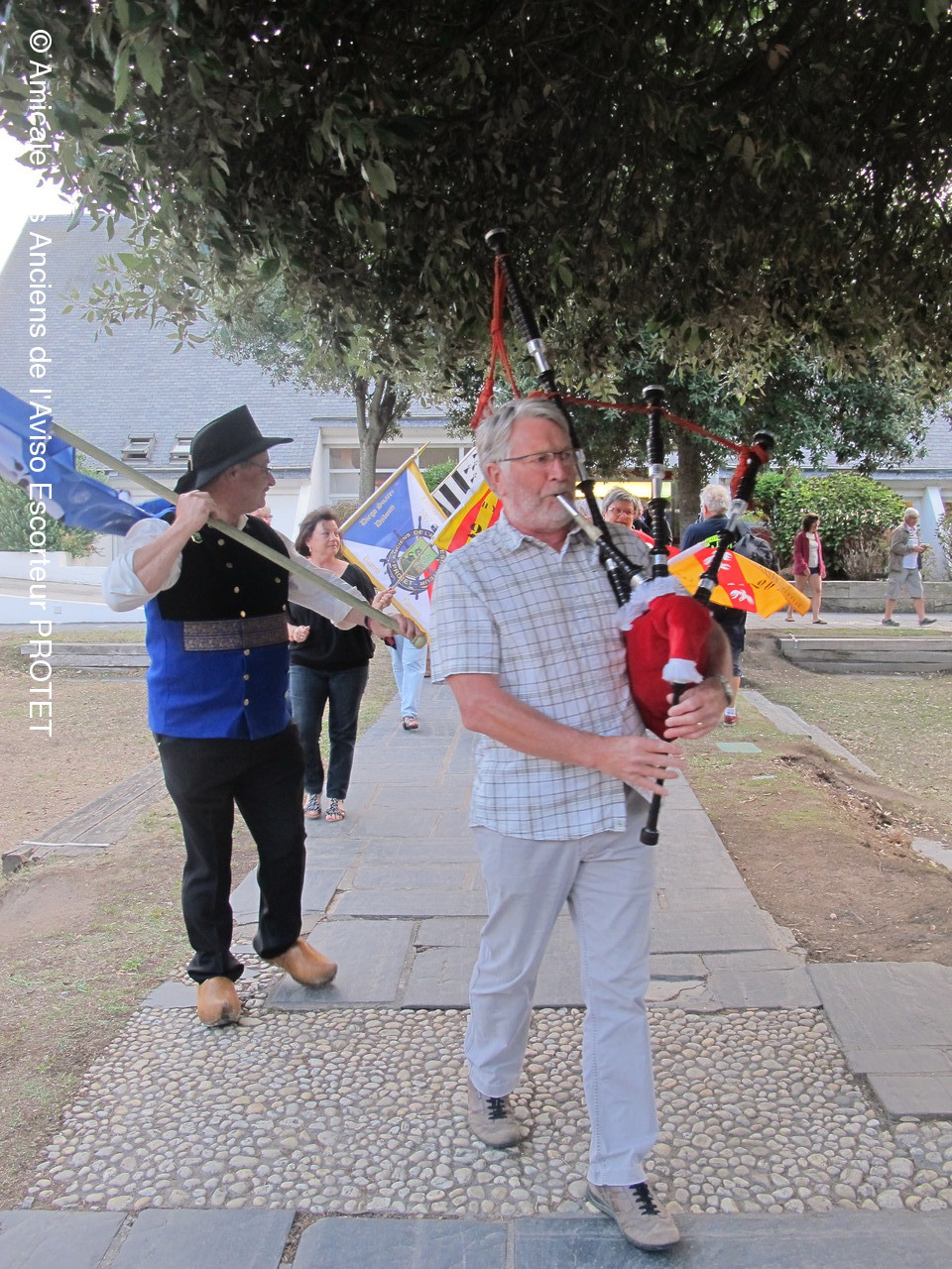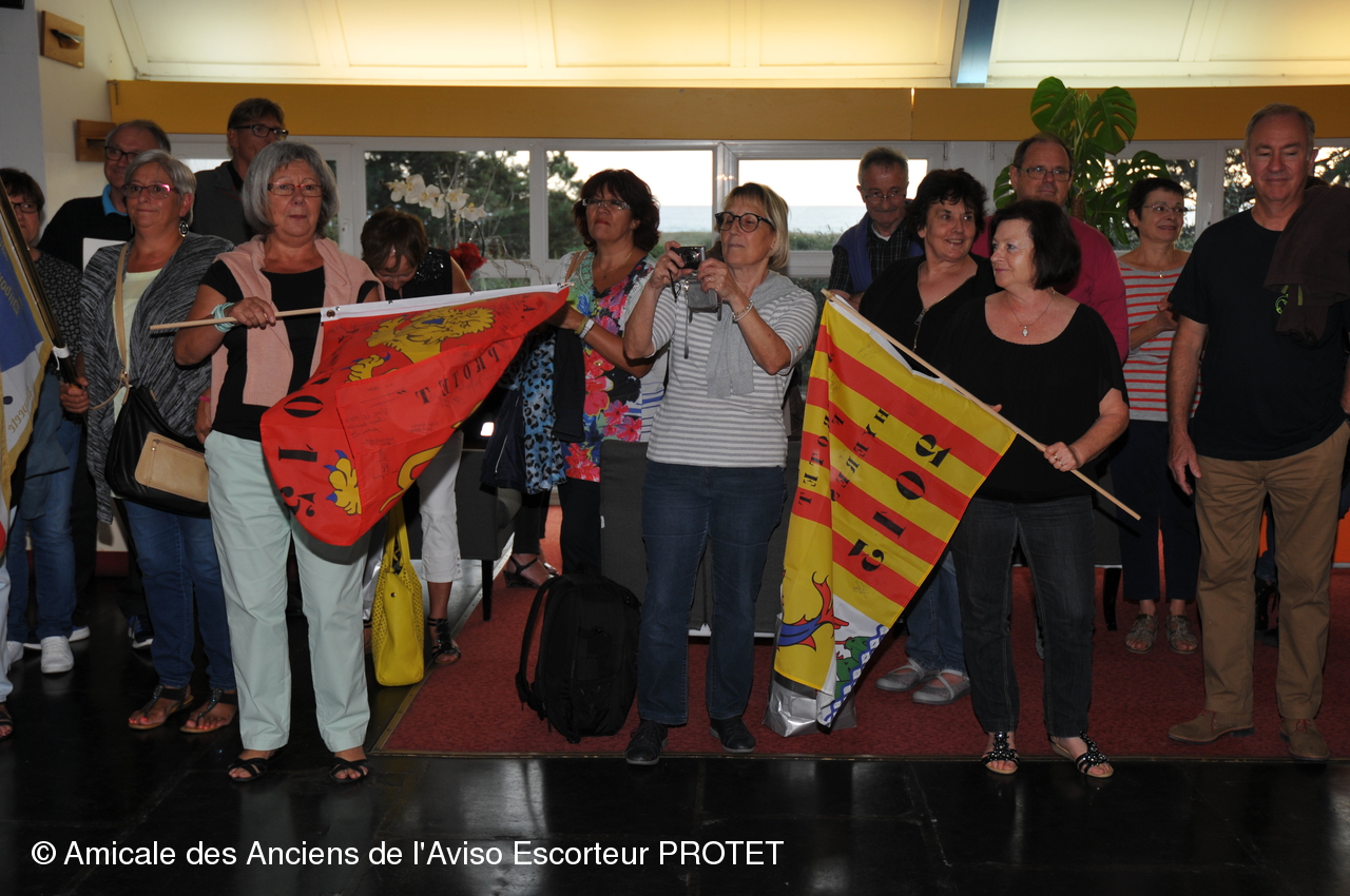 Merci à l'ami Pierrick pour son dévouement, sa disponibilité et pour le programme qu'il nous a préparé. Voila plus d'un an qu'il est dans les préparatifs de la réussite de ce rendez vous. Accueil dans le hall d'entrée du Club au son de la cornemuse, entrée des drapeaux, exposition d'objets de représentation du PROTET avec une complète marcophilie navale le représentant et des documents d'époque, voila une belle entrée en matière.