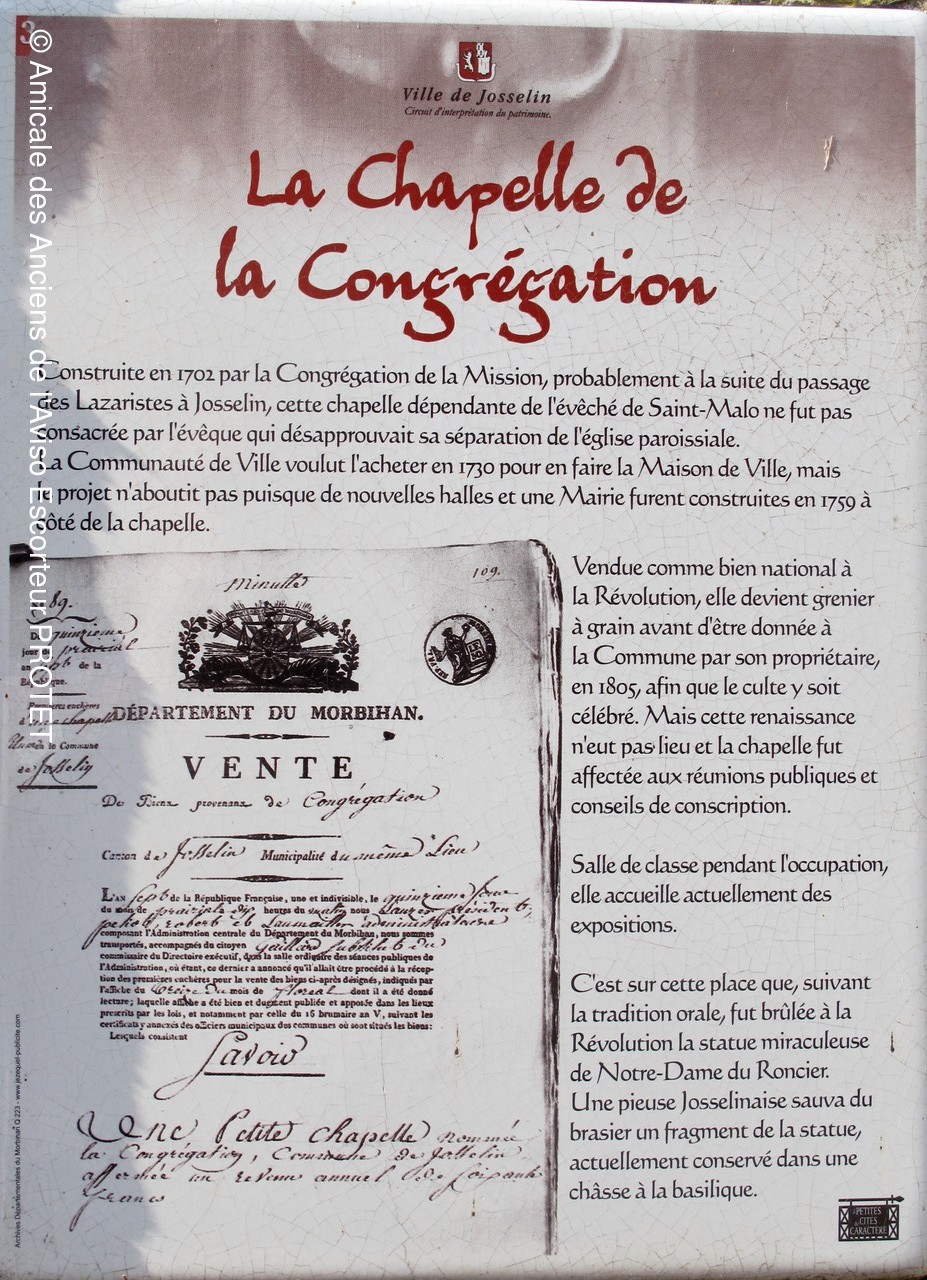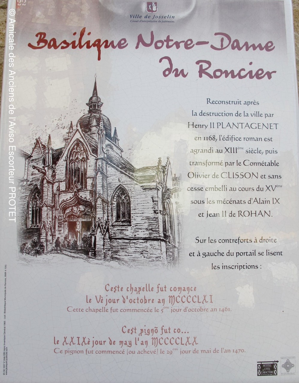 Selon la légende, une statue de la Vierge trouvée dans un roncier, près d’une source qui se révèle miraculeuse, est à l’origine de l’édification au XIIème de l’église de Josselin, qui deviendra une basilique au XIXème par décision papale, marquant ainsi son architecture particulière. Elle est consacrée à Notre-Dame du Roncier qui fait l’objet d’un pèlerinage annuel.